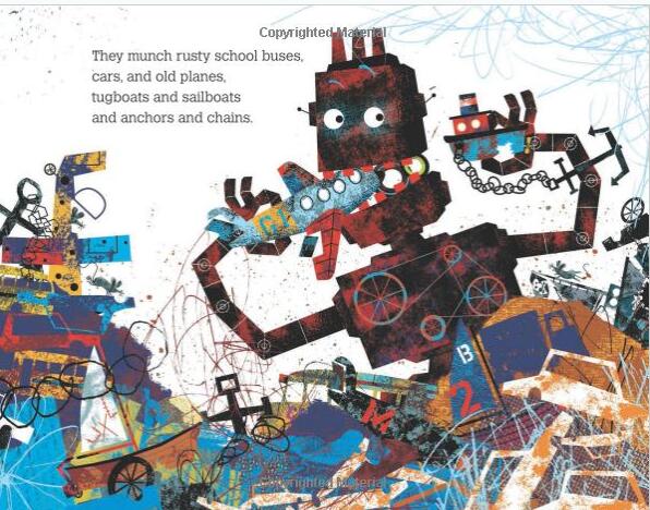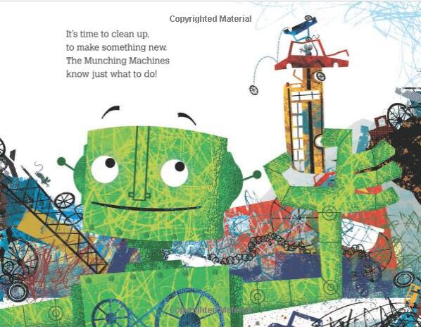Man the machines and help clean up the junkyard in this rousing robot story that encourages community building.