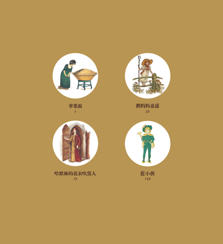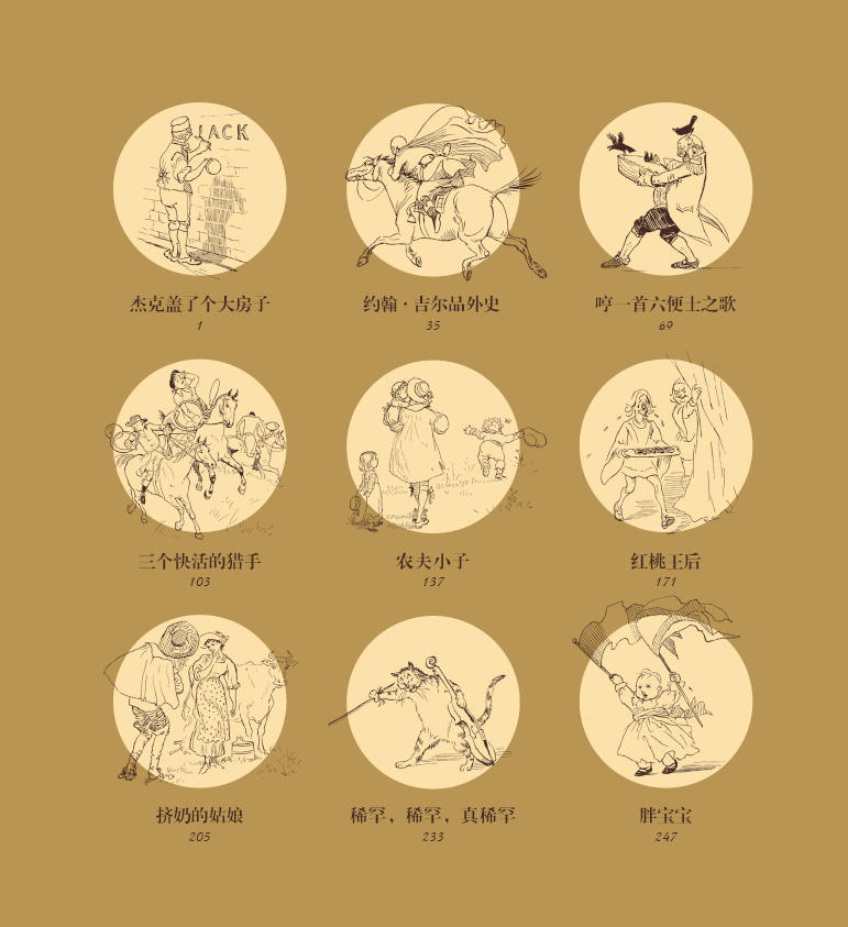 源于欧洲的传统童谣、故事,质朴而温暖,充满童趣和智慧,读来朗朗上口。凯迪克活泼生动的画风,曾受到梵高、高更的追慕,而凯特格林威的画风,则有着女性特有的细腻、柔美。世界最著名的图画书奖,是以这两个人命名的。今日有幸出版两位巨匠的作品,对于毛毛虫童书馆来说,何其有幸!目录