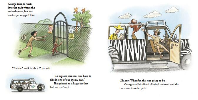 The zoo is the perfect place for a curious little monkey to make mischief and new friends! George is going to visit a new kind of zoo where the animals all roam free. Some of those animals look like a lot of fun—so much fun that a curious monkey can’t resist joining them. Giraffes and flamingos are close enough to touch, but George befriends a baby rhino who seems a little sad. Who better to lure her from her hiding place than George? And just in time for her special birthday party!