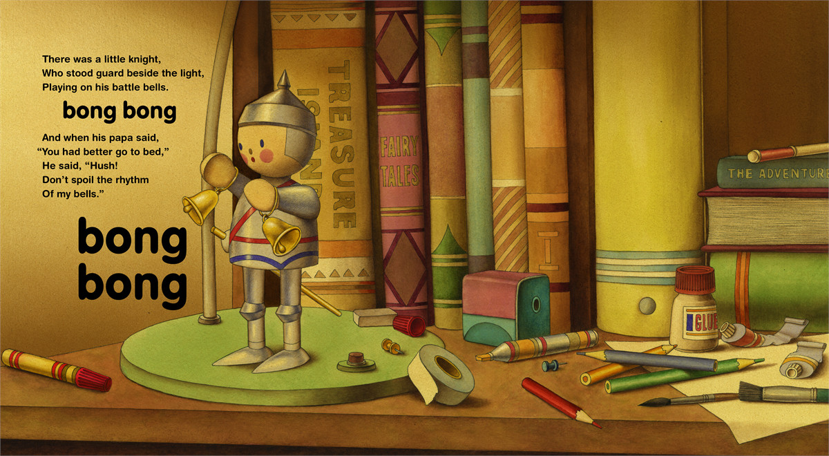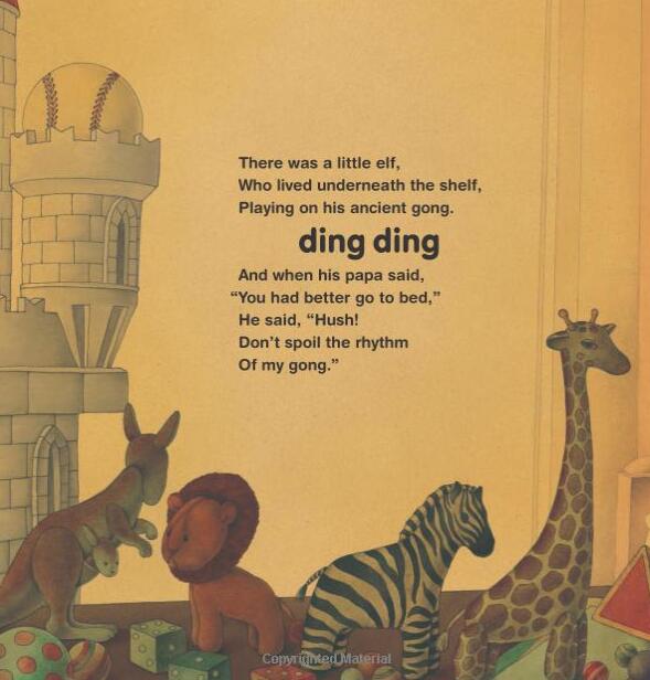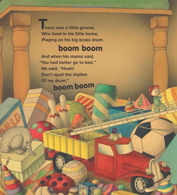 Inspired by a song learned in a Dalcroze class (where musical concepts are taught through physical movement), Geringer’s text pairs with Ibatoulline’s clean and clear images of a noisy nursery to create a cacophonous offering that settles down by the lights-out conclusion. When a little gnome is told to head to bed, he impersonates every wide-awake child in his reply to his mama: “‘Hush! / Don’t spoil the rhythm / Of my drum . . . Go away.’ / Boom boom.” Other toys join in the protest, such as an elf dinging a gong, a prince “neeeeeeing” on his bassoon, and mermaids “plong plonging” away on their harps. Between the introduction of each new musician, members of a cumulative chorus blast and blow their sounds across the page until a young human boy, who is master of the toys, falls asleep, and all settles down. Rich with group-participation possibilities and full of energy and noise, this offers timeless and colorful fun for the eyes and ears. Preschool-Grade 1. --Andrew Medlar