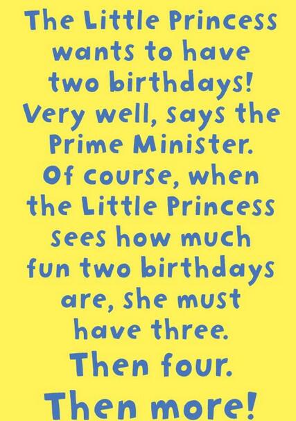 PreSchool-Grade 1—After an especially wonderful birthday, Little Princess decides that only one per year just won't do. She speaks with the Prime Minister, who puts a second birthday on the royal calendar. But, though two are definitely better than one, this still won't do. Gradually, Little Princess celebrates her birthday every day. The parties begin with special cakes and presents galore. However, the need to stay clean and to dress up each day becomes tedious, as do the smaller cakes, the insignificant presents, and the dearth of people who can attend daily parties and afford daily gifts. Thus is born the brilliant idea of having one "special" day each year that is different from all the rest—a day in which the child can get dirty and play whatever she wants. It's declared her "unbirthday" and falls on the day she was born. Ross's bright, cheerful trademark watercolor illustrations add much humor to this already funny tale about having too much of a good thing. Children love birthday celebrations and will be delighted with this newest "Little Princess" story.—Maryann H. Owen, Racine Public Library, WI