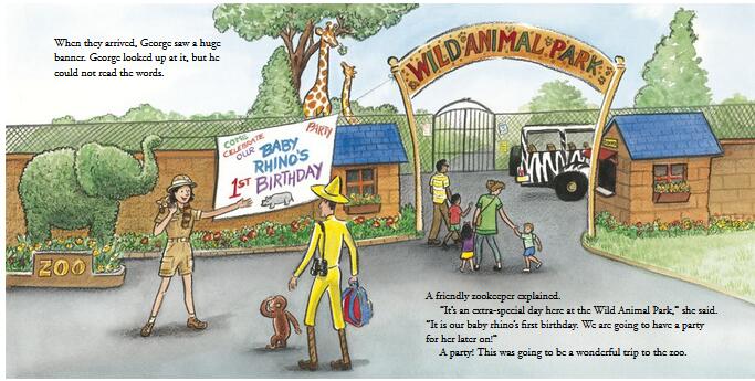 The zoo is the perfect place for a curious little monkey to make mischief and new friends! George is going to visit a new kind of zoo where the animals all roam free. Some of those animals look like a lot of fun—so much fun that a curious monkey can’t resist joining them. Giraffes and flamingos are close enough to touch, but George befriends a baby rhino who seems a little sad. Who better to lure her from her hiding place than George? And just in time for her special birthday party!