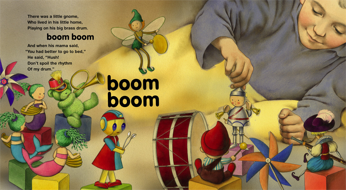 Inspired by a song learned in a Dalcroze class (where musical concepts are taught through physical movement), Geringer’s text pairs with Ibatoulline’s clean and clear images of a noisy nursery to create a cacophonous offering that settles down by the lights-out conclusion. When a little gnome is told to head to bed, he impersonates every wide-awake child in his reply to his mama: “‘Hush! / Don’t spoil the rhythm / Of my drum . . . Go away.’ / Boom boom.” Other toys join in the protest, such as an elf dinging a gong, a prince “neeeeeeing” on his bassoon, and mermaids “plong plonging” away on their harps. Between the introduction of each new musician, members of a cumulative chorus blast and blow their sounds across the page until a young human boy, who is master of the toys, falls asleep, and all settles down. Rich with group-participation possibilities and full of energy and noise, this offers timeless and colorful fun for the eyes and ears. Preschool-Grade 1. --Andrew Medlar